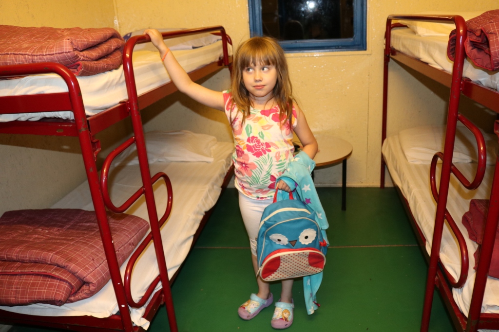 И уже детально рассматриваем домик утром. Внутри совсем маленький. Стены - дерево и ДСП. Стены просто аккуратно покрашены масляной краской. Все предельно просто: две двухэтажные железные кровати, два шкафа в углах и маленький столик. На полу линолеум.