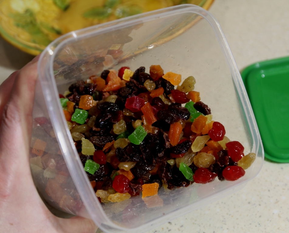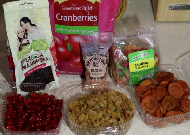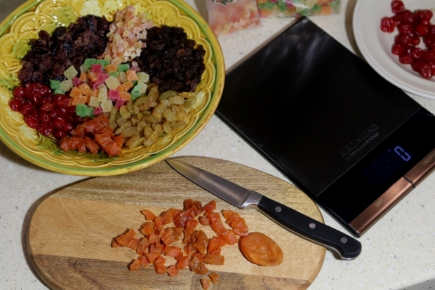 В принципе, Вы можете взять любые понравившиеся Вам или имеющиеся в наличие ингредиенты, главное, примерно соблюсти соотношение сухофруктов и теста. У меня получилось 400 г сухофруктов всего.