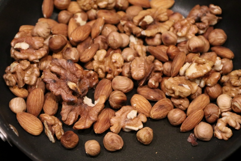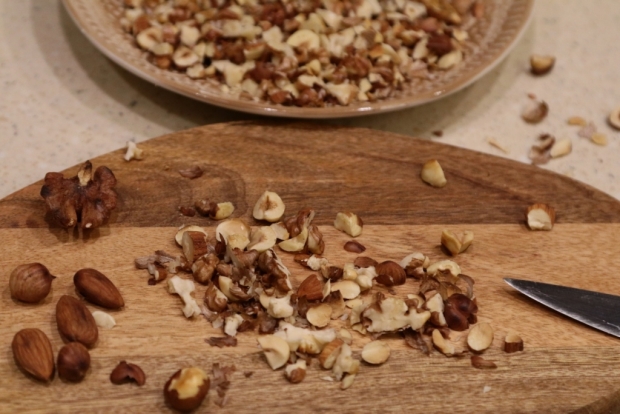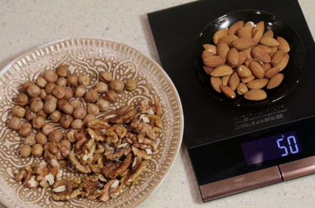 Я брала в равных количествах фундук, грецкий орех и миндаль. Всего у меня получилось 150 г орехов. Вы можете взять любые другие орехи при сохранение их суммарного количества.