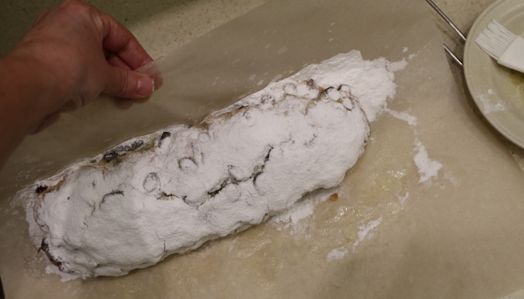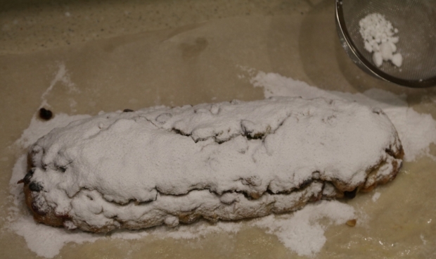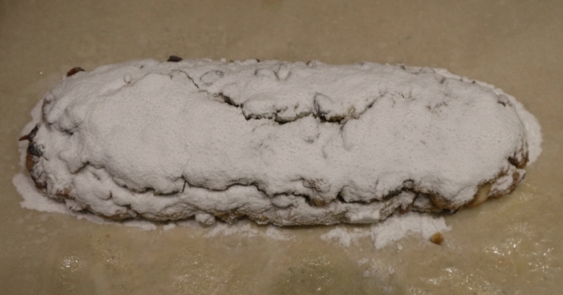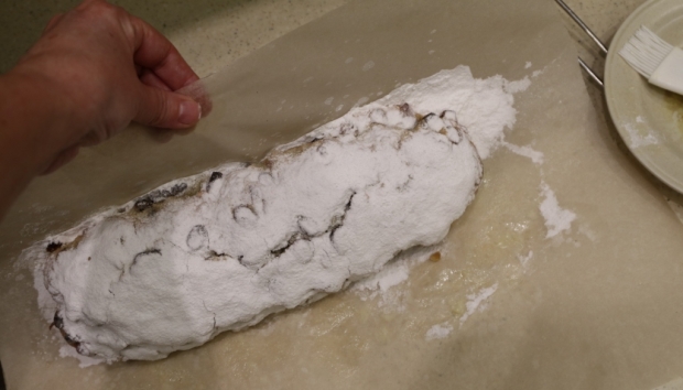 Если штоллен плохо остынет, то при плотной его упаковке в бумагу и фольгу для дальнейшего высстаивания, сахарная пудра может помокреть и штоллен потеряет внешний вид.