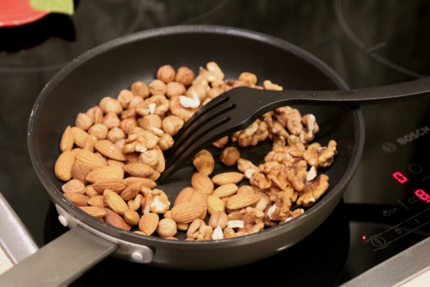 На достаточно большом огне нагреваем минут десять, все время помешивая, чтоб орехи слегка подрумянились. Затем отключаем нагрев и оставляем орехи до остывания на горячей сковородке.