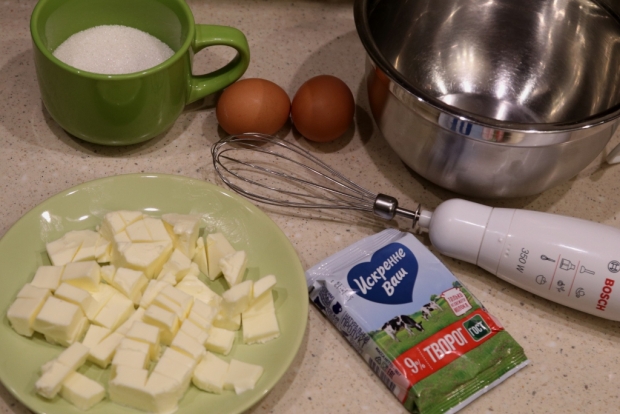 Для теста я использовала обычный мелкозернистый творог 9% жирности, можно взять и сливочный сыр.