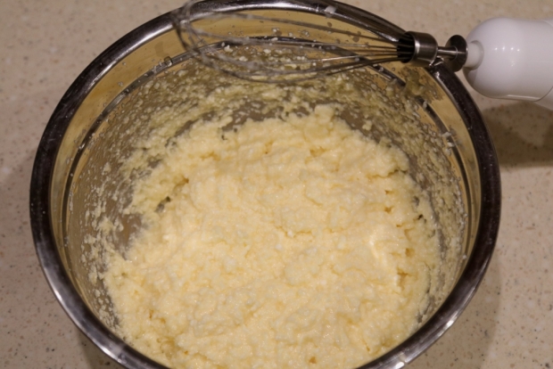 С помощью блендера венчиком смешиваем масло, творог, сахар и яйца до однородного состояния. Делать эту операцию можно в чаше комбайна, но мне не хотелось будить его шумом соседей (а готовила я после 12 ночи).