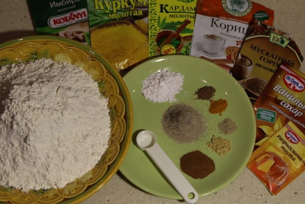 Муку смешиваем со специями и разрыхлителем для теста. Куркуму я добавила для придания штоллену желтого оттенка.