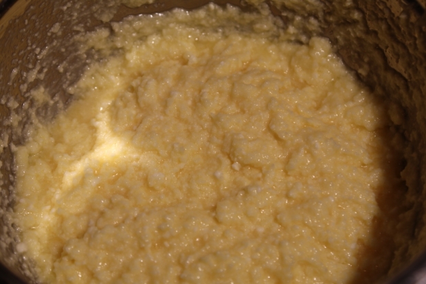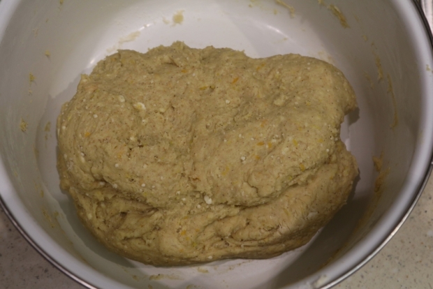 Вот такое тесто у меня получилось. Оно немного приставало к рукам и я его поставила в холодное место (у меня балкон, подойдет и холодильник) на пол часа, после чего оно застыло и стало более удобным в работе.