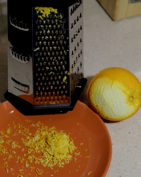 С помощью мелкой терки снимаем с апельсина цедру. Сдираем только желтую часть кожуры.