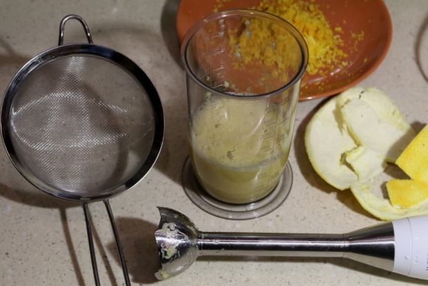 Оставшуюся белую кожуру чистим. Затем дольки апельсина измельчаем блендером до однородного пюре.