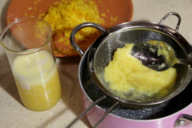 Откидываем полученную массу на сито и, придавливая ложкой, отживаем из нее сок. У меня получилось 150 мл сока.