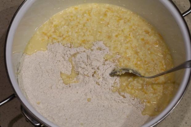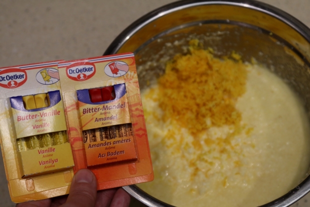 Смешиваем цедру, сок с полученной ранее творожно-яичной массой. Для большего аромата я добавила еще по одной ампуле ванильной и миндальной эссенции.