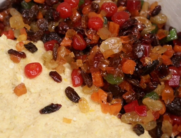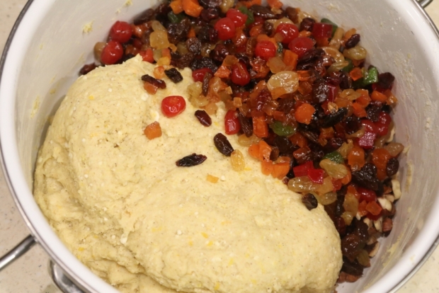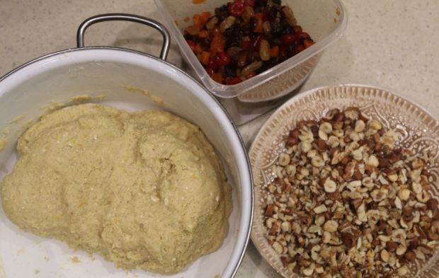 Добавляем в хорошо вымешаное тесто орехи и замоченные в роме сухофрукты.
