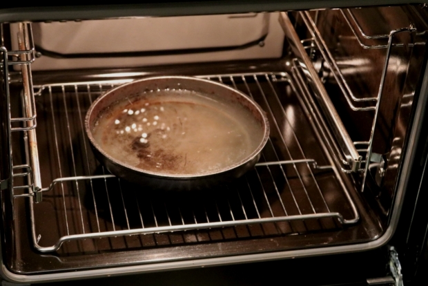 В духовку на дно кладем емкость с водой, а чтоб она не стояла непосредственно на нагреваемой поверхности духовки, я поставила ее на перевернутую вверх-дрыгом решетку.