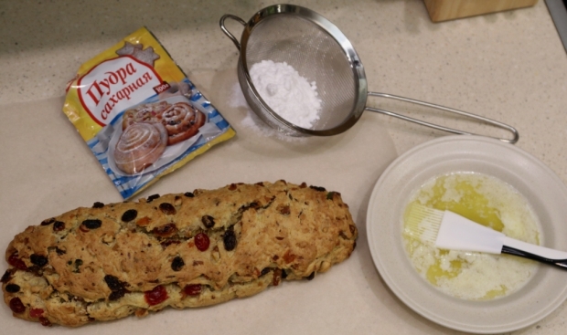 Посуду и ингредиенты для следующей операции нужно подготовить, пока штоллен находится в духовке, потому что дальше все нужно делать быстро, пока он горячий.
