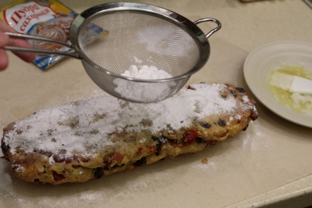 Переворачиваем штоллен вверх ногами, смазываем его нижнюю часть и быстро засыпаем сахарной пудрой через сито. Пудру надо насыпать в сито заблаговременно и аккуратно положить рядом. Чтоб из сита сыпалась пудра, надо легонько его пошатывать или постукивать по нему.