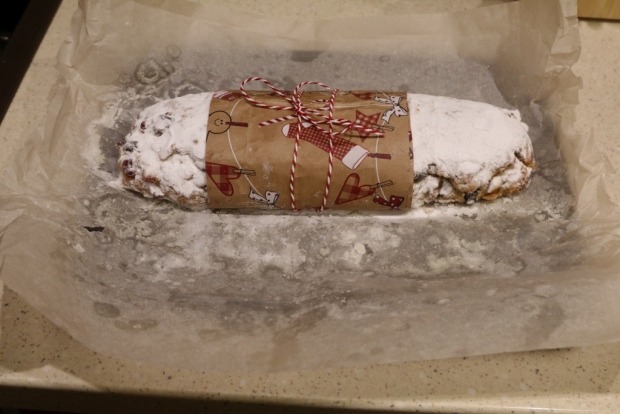 Удобно перемотать его бумагой по центру и перевязать, тогда центральная часть будет укреплена. Кроме того, когда Вы откроете штоллен на новый год, он будет иметь презентабельны вид.